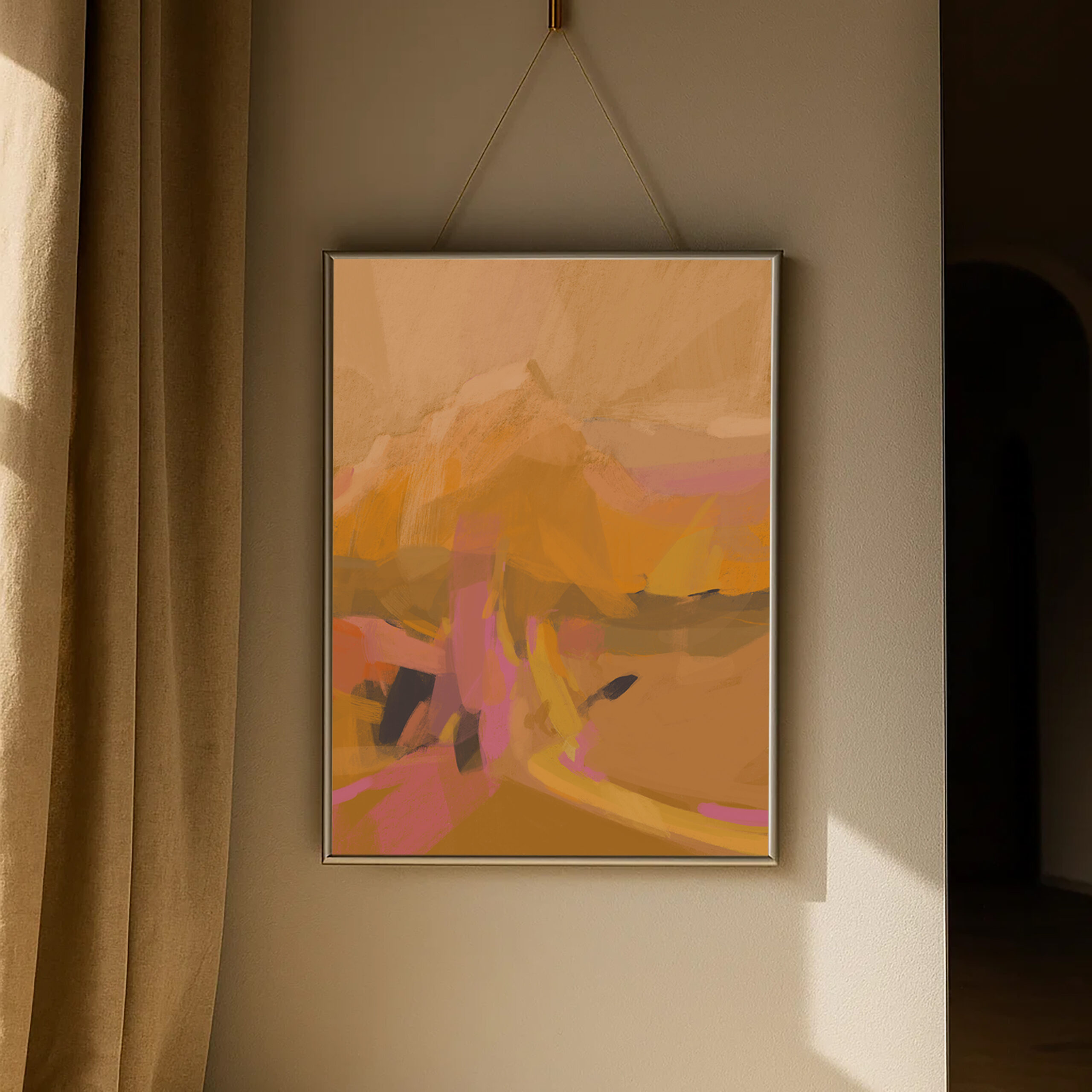 «Mürren Schweiz 17» – Abstrakt gemalte Berglandschaft inspiriert von Mürren in warmen Gold-, Orange- und Rosatönen. Verleiht jedem Raum eine elegante, alpine Wärme. Stilvolles Poster / Kunstdruck für Ihre Wanddeko in der Schweiz. Erhältlich in: 50×70, 30×40, 21×30, 13×18 cm.