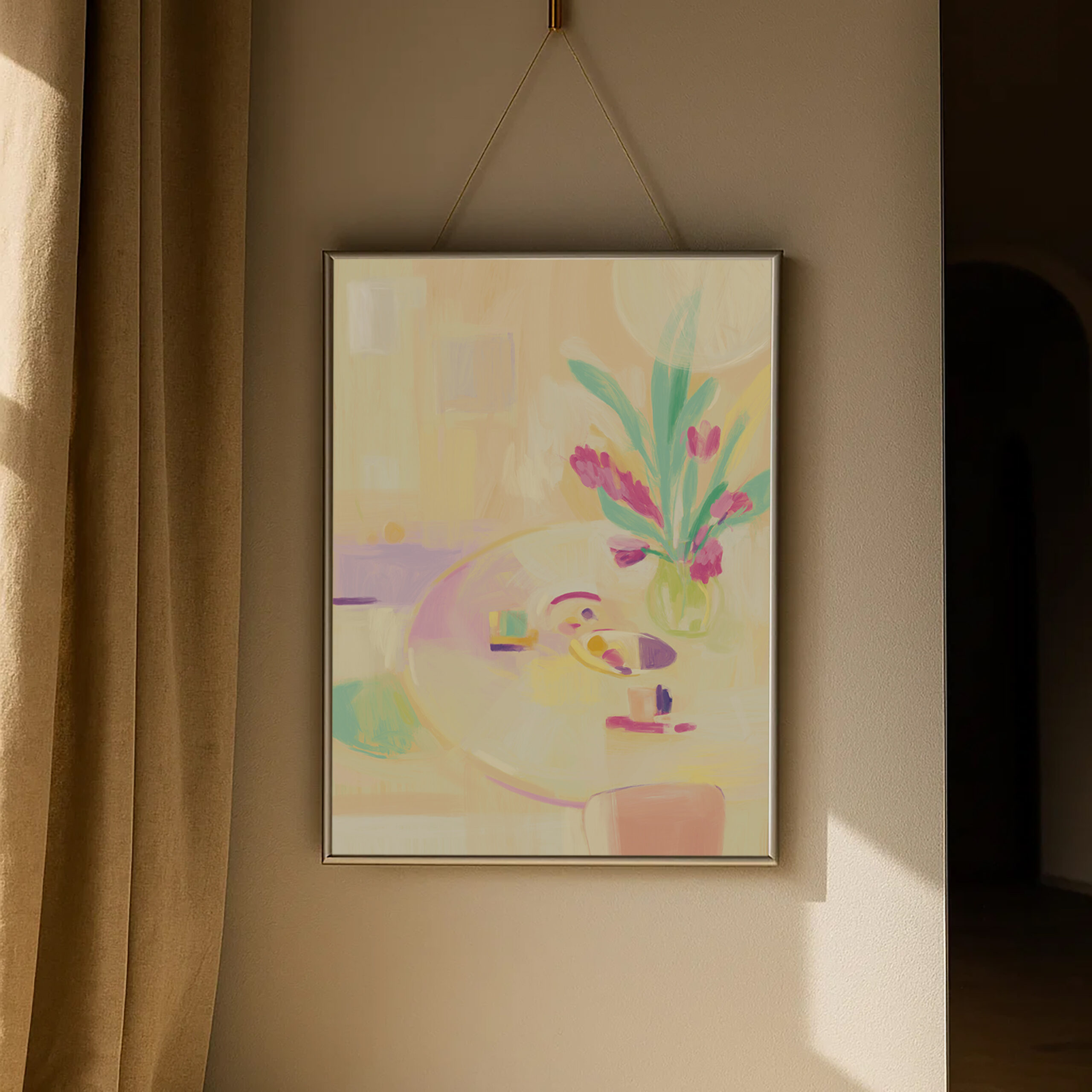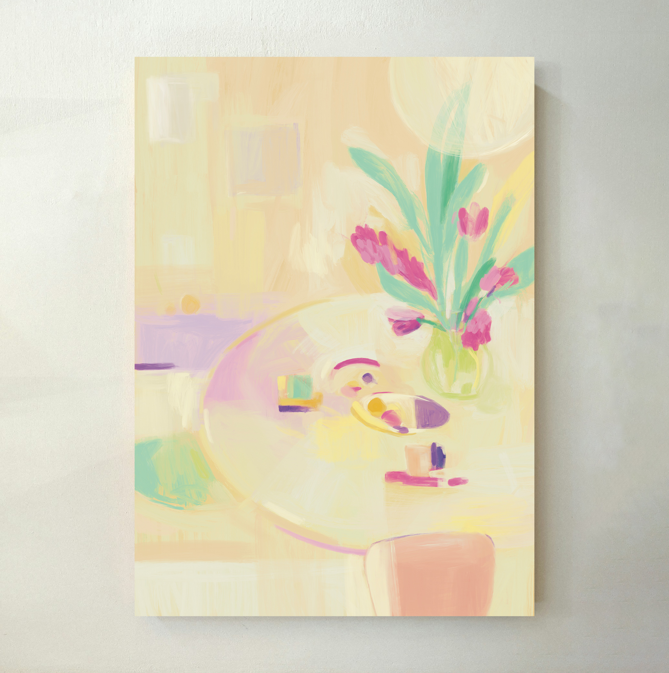 «Tischkomposition 79» – Zart gemalte Stillleben-Szene mit Blumenstrauß in Pink und frischen Grüntönen auf einem runden Tisch. Sanfte Pastellfarben bringen Wärme und Leichtigkeit in jeden Raum. Stilvolles Poster / Kunstdruck für Ihre Wanddeko in der Schweiz. Erhältlich in: 50×70, 30×40, 21×30, 13×18 cm.